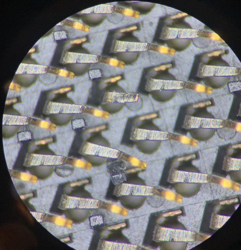 2. Omdat het dan toch kon, heb ik mijn thuis-workstation in de koffer gegooid en mee naar het werk genomen. De 2e GPU werd half-half herkend, en niet alle RAM werd herkend. Bij ons op het werk doen ze aan micro-electronica (chip/ASIC-design) en hebben we zo wel wat leuk spul staan in het labo, waaronder een microscoop die ze gebruiken om kleinere componenten te solderen. Moederbord uitgebouwd en onder de microscoop gelegd. Eerder had ik al gezien met het blote oog dat er een pinnetje scheef stond. Met de microscoop kan je veel beter zien en met vaste hand zo'n pinnetje wel terug recht duwen. Had ik eerder ook al gedaan. Alleen, ... zat het niet mee. Conclusie: pinnetje van 1 van de CPU-sockets afgebroken. Valt sowieso niks aan te doen
